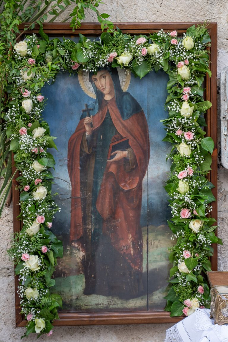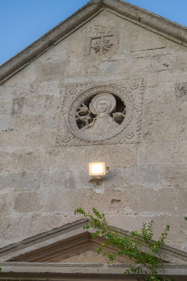 Πάνω από την κύρια είσοδο του ναού βρίσκεται εντοιχισμένο ένα πέτρινο γλυπτό που παριστάνει την Αγία Παρασκευή να κρατά στο ένα χέρι τον Σταυρό και στο άλλο ένα κλαδί φοίνικα, σύμβολο νίκης και αθανασίας.